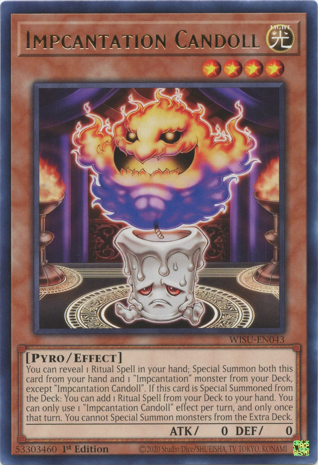 You can reveal 1 Ritual Spell in your hand; Special Summon both this card from your hand and 1 "Impcantation" monster from your Deck, except "Impcantation Candoll". If this card is Special Summoned from the Deck: You can add 1 Ritual Spell from your Deck to your hand. You can only use 1 "Impcantation Candoll" effect per turn, and only once that turn. You cannot Special Summon monsters from the Extra Deck.