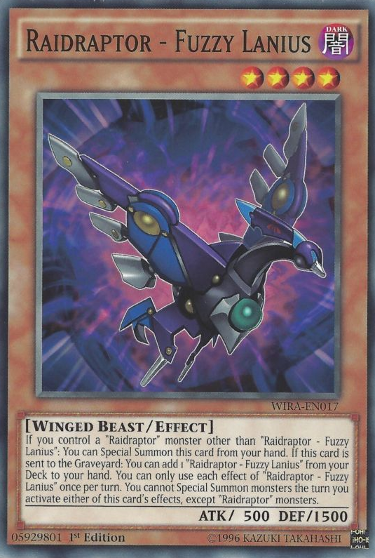 If you control a "Raidraptor" monster other than "Raidraptor - Fuzzy Lanius": You can Special Summon this card from your hand. If this card is sent to the Graveyard: You can add 1 "Raidraptor - Fuzzy Lanius" from your Deck to your hand. You can only use each effect of "Raidraptor - Fuzzy Lanius" once per turn. You cannot Special Summon monsters the turn you activate either of this card's effects, except "Raidraptor" monsters.