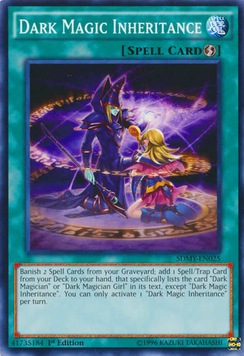 Banish 2 Spell Cards from your Graveyard; add 1 Spell/Trap Card from your Deck to your hand, that specifically lists the card "Dark Magician" or "Dark Magician Girl" in its text, except "Dark Magic Inheritance". You can only activate 1 "Dark Magic Inheritance" per turn.